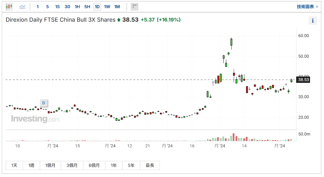Direxion Daily FTSE China Bull 3X Shares (NYSE:YINN)昨夜暴升超16%,创逾三周新高!