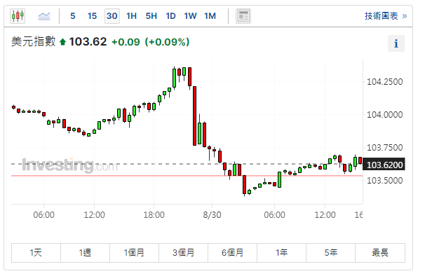 截至北京时间16:00(美国东部时间上午04:00),衡量美元兑六种贸易加权主要货币走势的 美元指数期货 升0.13%,报103.607; 美元指数 升0.09%,报103.63,前一交易日大跌0.4%,创一个半月来最大单日跌幅。