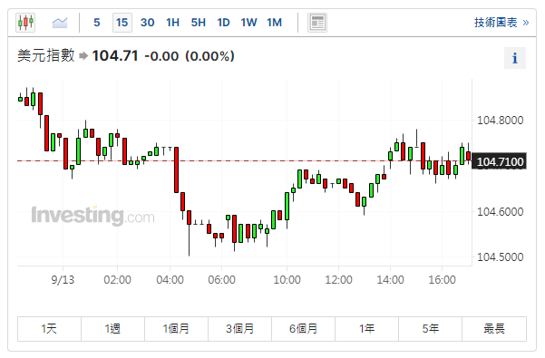 截至北京时间17:16(美国东部时间上午05:16),衡量美元兑六种贸易加权主要货币走势的 美元指数期货 升0.03%,报104.370; 美元指数 升0.01%,报104.72。
