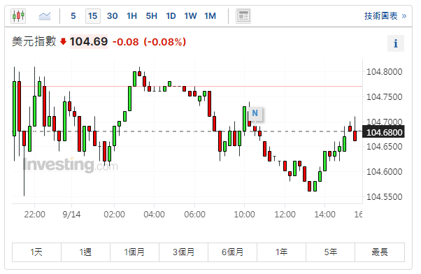 截至北京时间15:42(美国东部时间上午03:42),衡量美元兑六种贸易加权主要货币走势的 美元指数期货 跌0.04%,报104.355; 美元指数 跌0.08%,报104.69。
