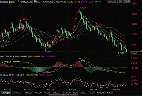 周三(9月20日),美元兑一篮子货币周三走高,其中欧元当日下跌0.17%,收盘在1.0661。在当日的利率会议上,美联储维持利率不变,但立场更趋鹰派,预计年底前将再加息一次。与6月份一样,美联储决策者的预估中值仍是指标隔夜利率目标区间今年将在5.50%-5.75%触顶,仅比当前水平高出25个基点。会后,美联储主席鲍威尔表示,虽然有些事情超出了联储的控制范围,但美联储激进加息很有可能不会使经济陷入衰退。美联储利率决定公布后,对利率敏感的两年期美债收益率周三创下17年新高。美联储似乎仍然在加息事项上尽可能释放着鹰派的态度。这无疑将继续对其他币种构成沉重的压力。隔夜市场上,欧元/美元受美联储鹰派表态施压下行,但幅度显得不大。主要是交易员还在继续等待周四欧央行的利率会议出炉结果。如果欧央行按兵不动,欧元恐会继续遭受抛售的压力延续下行趋向。相反若意外加息25个基点,或能给到欧元些许的提振,帮助欧元做出短期整理性的反弹。目前下方1.06的支撑较为关键,若跌穿将威胁1.05水平。上方1.08水平附近构成短期内的初步阻力所在。