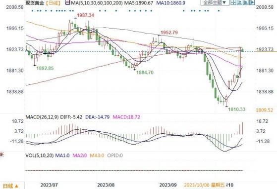 由于中东冲突加剧导致投资者纷纷涌入避险资产,金价周五上涨逾3%,创下3月中旬以来的最大单周涨幅,黄金较上周收盘价高出90美元以上。周五(10月13日)收市,现货黄金上涨3.42%,收报1932.71美元/盎司。
