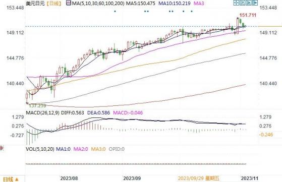 周四(11月2日),美元全线下跌,美元兑日元下跌0.3%,至150.44收盘,脱离了本周稍早触及的一年高位,盘中最低曾至149.83水平。美联储周三维持利率不变,决策者仍无法确定金融条件是否已收紧到能够控制通胀的程度,或者经济表现继续超出预期是否还需要进一步施加限制。不过,投资者愈发相信美国利率已经达到峰值,联邦基金利率期货市场认为12月加息的可能性低于20%。这种观点在周四提振了投资者的风险偏好,美元承压全线下跌,日元也是间接受惠。但是,日本央行在结束宽松货币政策上的缓慢推进,始终无法挑起市场对日元的青睐。反而推动交易员不断推低日元以测试日本政府所能容忍的红线在何种水平。因此,从宏观面上来看,只要日本央行在结束宽松货币政策道路上拖慢行程,那么日元转强就存在一定的难度。短时间内,能帮助日元稳定下来的因素,就看日本央行是否出手施加干预。小时线和日线图上,美元/日元尚继续处于布林带通道中轨线稍上方,还未显示该货币对有转向的信号。目前150水平成为了支撑线,若能跌落该水平之下,则有望进一步缓解日元贬值的紧张氛围。而上方一旦捅穿年内高点151.74水平,那么美元/日元将继续往高点探试。