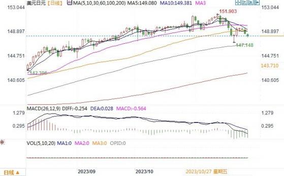 周一(11月27日),美元兑日元下跌0.6%,至148.59。当天来自美国数据显示,10月美国新屋销售降幅大过预期,经季节性因素调整后销售年率为67.9万户,下降5.6%。9月读数下修至71.9万户,前值为75.9万户。经济数据走软进一步助长对美联储转鸽的押注,芝商所联储观察工具(CME FedWatch)显示,美联储明年5月降息至少25个基点的可能性略高于50%。而日本服务业通胀攀升,显示价格压力扩大,日本央行短期内结束超宽松货币政策的可能性加大。在两国利率此消彼长的预期氛围之下,日元继续大幅贬值的空间渐渐显得有限。本周稍后还有美国的第三季度GDP(国内生产总值)、个人消费支出(PCE)物价指数等重要经济数公布,须加以密切留意。若数据继续展示出经济走软的图像,势必推动美元/日元继续下行。日线图上,美元/日元反弹整理在149.70附近遇阻后朝着布林带下轨线下滑。下方148.10-148.00的支撑较为关键,若跌穿该支撑位置,美元/日元的下行空间有望进一步拓深。