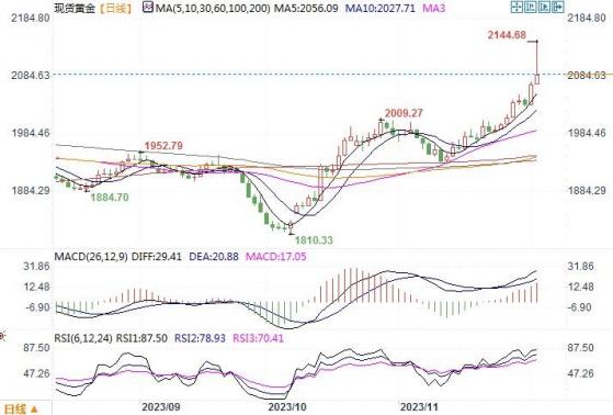 上周五,美联储主席鲍威尔对于加息保持谨慎态度,称紧缩不足和过度紧缩的风险正变得更加平衡,但美联储现在并没有降息的想法。市场解读鲍威尔发言偏向鸽派,预期美联储可能已结束加息。根据芝商所(CME)的“美联储观察”工具,鲍威尔发言后,美国利率期货反映明年3月降息的机率为64%,远高于上周四的43%。美联储在明年5月降息的机率也从周四的约76%飙升至90%。纽约独立金属交易员提出分析意见说:“黄金多头把焦点放在鲍威尔对利率已处在限制性水平这件事上,这为降息即将到来的题材提供支撑,而对鲍威尔关于现在臆测降息为时尚早的警告显然不以为然。”鲍威尔讲话叠加近期显示通胀和经济发展的重要经济数据显示疲软,市场似乎已笃定美元加息可能已经结束,而且很可能比原先预期更早降息。为此,黄金似乎也进入了加速开启上涨的交易模式。本周还将迎来美国非农数据。如果就业市场显示更加平衡的证据,将强化美联储已经结束加息的观点,并可能进一步推动金价升至创纪录高位。除非就业数据出奇的好于预期,否则难改黄金的强势表现。