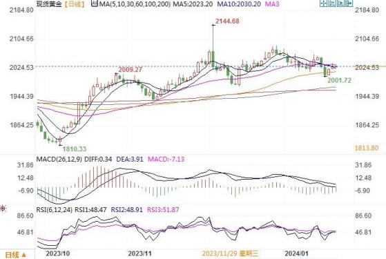 最近公布数据提醒人们,通胀压力依然存在。美国12月份物价上涨速度快于预期;零售销售以三个月来最强劲的速度增长。美国消费者信心强劲回升,1月份密歇根大学消费者信心调查为78.8,高于12月份的69.7。对利率预期特别敏感的2年期国债收益率,在美国最新通胀数据公布后有所攀升,比去年年底高出0.13个百分点。此外,继上周二美联储理事沃勒发出降息须谨慎推进的言论后,芝加哥联储总裁古尔斯比周五表示,美联储需要掌握更多通胀数据,才能做出任何降息判断。亚特兰大联邦储备银行总裁博斯蒂克周四表示,基线预测是第三季度开始降息。为此,眼下投资者已缩减了对提前降息的押注,目前期货市场定价美联储3月份降息的可能性已降至约为48%。摩根士丹利投资管理公司联席首席投资官吉姆?卡伦(Jim Caron)认为,如果今年美联储降息次数少于5次,“那么债券收益率自然要上升”。美债收益率保持在高位,势必也能提振美元维稳并有一定幅度的上升。这也导致了国际现货黄金近期的上涨动力出现退潮的表现。本周,美国即将发布的数据需重点关注1月份制造业和服务业采购经理人指数(PMI)的发布;周四(25日)公布的第四季GDP增长率的另一次修订。荷兰国际集团(ING)展望称,市场对3月份美联储利率决议的信心在过去一周已经被充分消化,并且在未来一周可能会进一步减弱。降息时点不明朗之前,将有可能在一定时期内影响着黄金的走势。