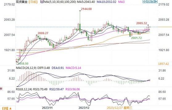 技术层面上,从日线图上来看,金价似乎已成功向上突破近一个月来形成的对称三角形上边线。技术指标14日相对强弱指数(RSI)开始穿越中线上摆,MACD双线形成金叉,显示黄金多头再度积蓄上行的动能。日内若美国非农数据显示进一步松缓,那么黄金多头将会继续攻击隔夜高点2065美元,穿越后有望进击2080美元。目前来看2030-2035区域构成了初步的支撑。