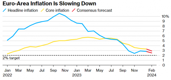 货币市场押注欧洲央行将在美联储7月降息前一个月开始降息,因为欧元区的价格压力缓解速度快于美国。欧元区20国的通货膨胀率在2023年有所下降,欧洲央行预计这一趋势今年将继续下去,尽管会更加温和。据经济学家称,2月份的增速可能会放缓至2.5%。欧盟统计局将于周五公布该数据。