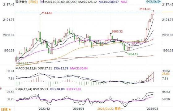 周三(3月6日), 黄金在主要受美国放宽货币政策押注推动的强劲势头基础上,继续创造出历史纪录高位。当日现货金上涨0.8%,至每盎司2,145.09美元,盘初曾触及2,152.09美元的历史高点。