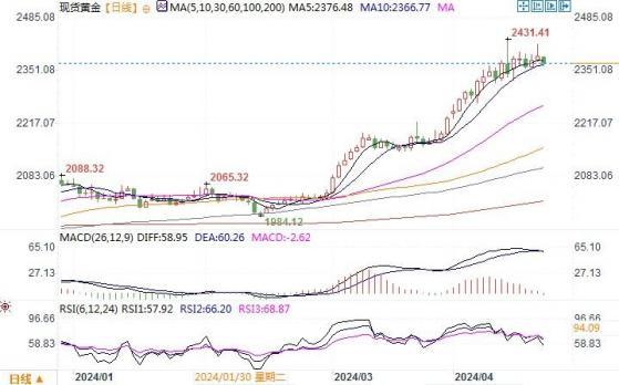 周五(4月19日),由于市场担忧伊朗和以色列之间发生进一步针锋相对的报复行动,引发避险需求,金价攀升。现货金上涨0.7%,报每盎司2,395.15美元,稍早一度高见2,417.59美元,然收盘阶段颇显犹豫,最终还是回落2400关口之下。周五稍早,伊朗一座城市上空回荡着爆炸声,消息人士称这是以色列发动的袭击,这是两个宿敌之间最新一次针锋相对的交火,双方数十年的暗战似乎走向公开化,有可能将该地区拖入更深的冲突之中。但德黑兰淡化了这一事件,并表示没有报复计划。伊朗方面的反应,似乎也显示伊以双方也是极力想避免事态的进一步恶化。而一旦地缘冲突行势有缓,那么投资者的目光最终还是要回归到经济发展层面上。这对短期内的黄金来说恐怕不是一个利好因素。因为,近期美国接二连三地公布强于预期的经济增长以及粘性十足的通胀数据,已经使利率期货市场对于美联储6月份降息预期基本为零,降息时点预期也是大大延后,甚至还有大型机构预期美联储存在着恢复升息的可能性。在五月美联储议息会议前,本周美国将有第一季度GDP和3月份个人消费支出(PCE)物价指数等重磅数据登场。如果数据一如前几周所公布的数据一般,显示美国经济增长强劲、通胀高踞不下,势必进一步降低美联储将在年内降息的预期和概率。那么在高息撑持下的美元将有极大机会继续保持强势,而黄金则恐怕要陷入调整回落的风险。