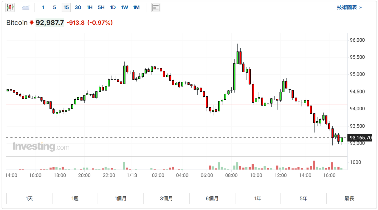 周一,1月13日, 比特币 (BitfinexUSD)日内大幅波动,亚市早盘一度升至95906.9美元,逼近9.6万美元大关,现跌穿9.3万美元,报92987.7美元。