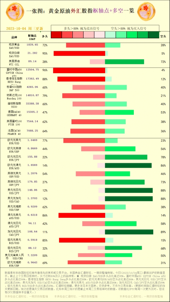 一张图:2023/10/04黄金原油外汇股指"枢纽点+多空占比"一览