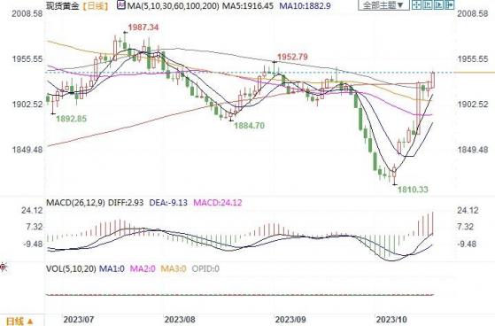 最新发布的数据显示,美国9月零售销售月率录得0.7%,是华尔街0.3%的增长预期的两倍多。不包括汽车和天然气的销售额增长0.6%,高于彭博社编制的0.1%增长预期。 与此同时,8月份销售额从之前报告的0.6%增幅上调至0.8% 。虽然美国9月份零售销售增幅超出预期,但有经济学家指出,有一些不利因素正在影响着美国消费者,信贷使用增加和信用卡拖欠的早期迹象可能会在一定程度上抑制消费乐观情绪。这说明,经过长达一年多的加息以来,长期借款成本的上升对需求构成下行压力,但目前尚不清楚这将如何影响联储两周后的利率决定。因此该项数据并未能刺激美元走升。继而投资者将注意力转向了美联储官员本周的讲话,包括主席鲍威尔周四的发言,以寻找有关利率政策的进一步线索。旧金山联储主席戴利表示,近期长期债券收益率的飙升相当于加息25个基点。进一步加息的风险可能会使经济陷入衰退。费城联储行长帕特里克?哈克周一表示,央行不应通过进一步提高借贷成本来给经济带来新的压力。哈克重申,美联储不会在通胀压力减弱的环境下加息。根据 CME 集团 (NASDAQ: CME ) Fedwatch 工具,交易员认为美联储将利率维持在 5.25%-5.50% 不变的可能性为 90%。2023年剩余两次货币政策会议再次加息的几率保持在30%不变。因此在经济发展以及利率前景这方面,黄金受到的压力似乎开始有所减轻。再加上巴以冲突仍然是市场关注的焦点,避险买盘热度短时间内必不会迅速降温。为此,黄金受支撑的因素似乎占优。